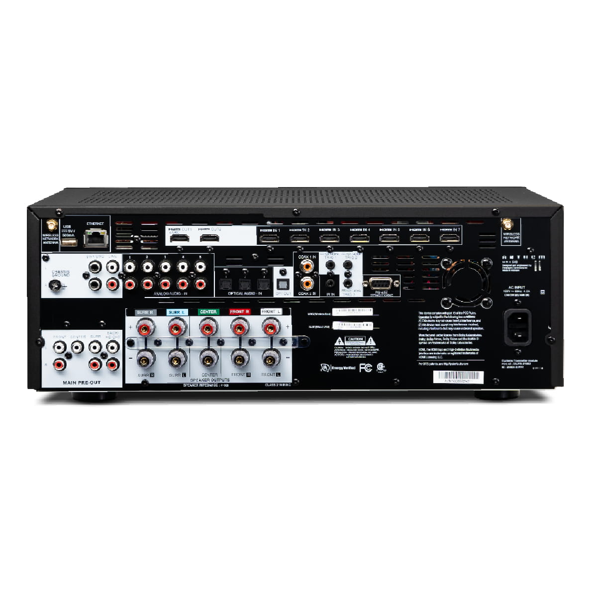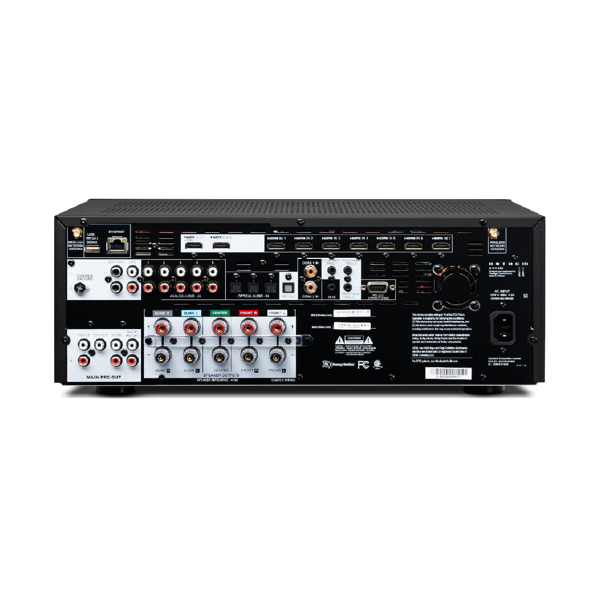 | Moc wyjściowa na kanał / impedancja | 100W (kanały 1-5, dwa zasilane @ 8 ohm) 130W (kanały 1-5, dwa zasilane @ 6 ohm) Kompatybilny z 4 ohm lub więcej |