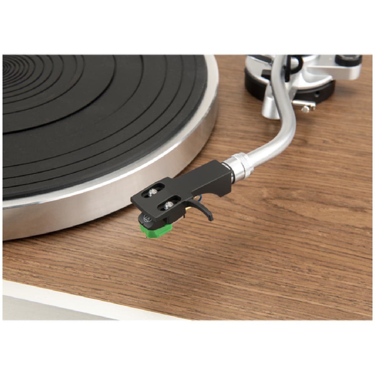 Uzyskaj intymność ze swoją kolekcją płyt dzięki JBL TT350 Classic. Dzięki cokołowi pokrytemu fronirem z drewna orzechowego, ciężkiemu aluminiowemu talerzowi i zakrzywionemu aluminiowemu ramieniu, TT350 Classic jest świadectwem radości z muzyki i płyt winylowych. Silnik Direct Drive zapewnia odtwarzanie płyt w idealnym czasie z potężną dynamiką przy 33,3 obr / min dla płyt LP i 45 obr / min dla EP i singli. Prędkości obrotowe są blokowane za pomocą czujnika prędkości w celu uzyskania idealnej wysokości dźwięku. Ramię jest wyposażone w wysokiej jakości wkładkę z ruchomym magnesem wstępnie zainstalowaną na zdejmowanej głowicy w celu łatwej wymiany i modernizacji. Pionowy kąt śledzenia (VTA) jest regulowany, aby umożliwić stosowanie większych lub mniejszych wkładek podczas modernizacji. Nóżki są tłumione, aby zmniejszyć wibracje przedostające się do płyty i regulowane, aby umożliwić ustawienie TT350 Classic na nierównych powierzchniach.