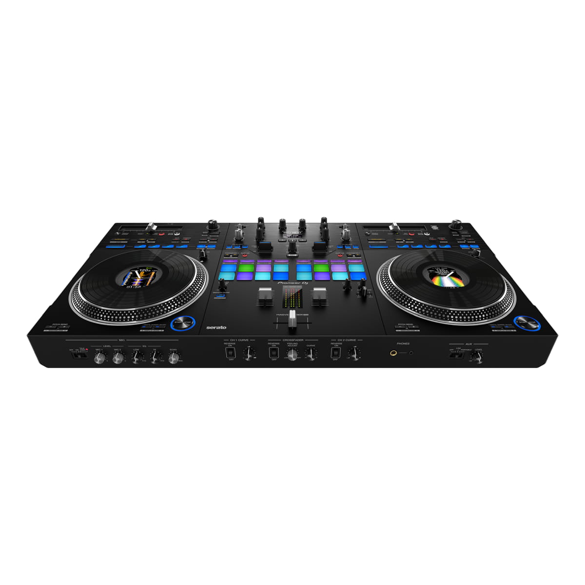 DDJ-REV7 jest solidny i wytrzymały, a jednocześnie wystarczająco lekki, aby podnieść go za uchwyty na obudowie i zabrać na następną imprezę. Kontrastujące wykończenie z matowego i szczotkowanego aluminium na płycie górnej pozwala wizualnie oddzielić od siebie sekcje decków i miksera, dzięki czemu układ przypomina tradycyjny zestaw 2 x gramofon + mikser. Natomiast wyświetlacze na kołach jog wyglądają jak etykiety na środku płyt winylowych.