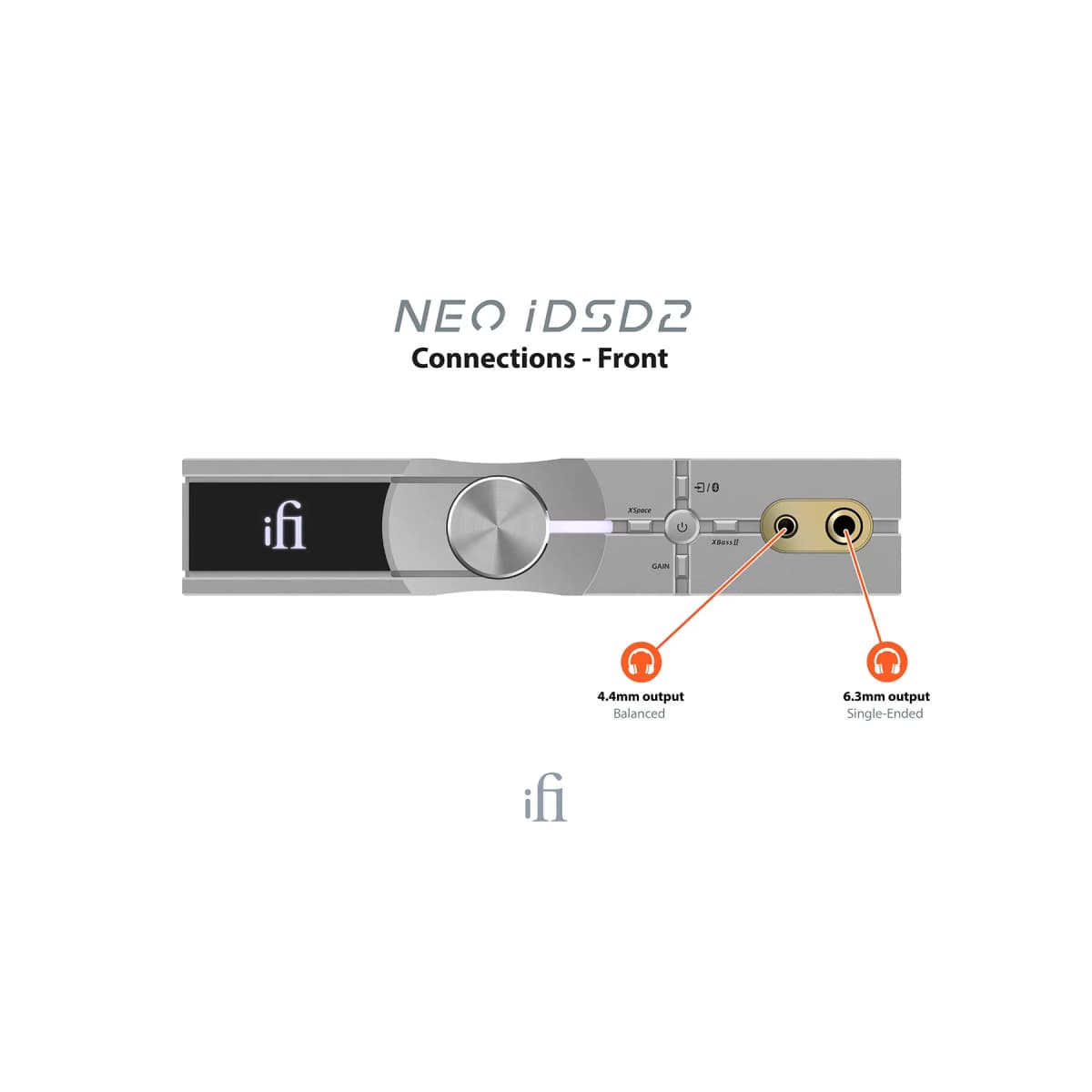 Dostępne są również zbalansowane wyjścia analogowe, co pozwala w pełni wykorzystać całkowicie zbalansowane obwody NEO iDSD 2. Z przodu, obok standardowego, gniazda słuchawkowego single-ended 6.3 mm, znajduje się wyjście słuchawkowe 4.4 mm zapewniające zbalansowane połączenie. Coraz większa liczba wysokiej jakości słuchawek i IEM'ów jest tak wyposażona lub oferuje możliwość odłączenia kabla i przejścia na zbalansowane złącze 4.4 mm. Z tyłu znajdują się wyjścia RCA z pojedynczą końcówką i zbalansowane gniazda XLR, umożliwiające podłączenie NEO iDSD 2 do wzmacniacza i głośników (lub pary aktywnych głośników).